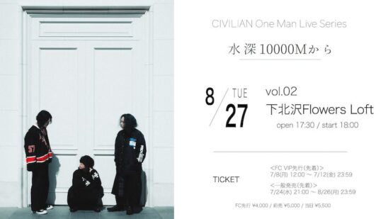SCHEDULE 2024 08 27 Tuesday CIVILIAN One Man Live Series “水深10000Mから” vol.2 OPEN 17:30 - START 18:00 Tweet 出演: CIVILIAN TICKETFC ¥4,000 / 前売 ¥5,000 / 当日 ¥5,500 ※入場時別途ドリンク代 ¥600 (現金のみ) 一般発売 受付中(先着) https://t.livepocket.jp/e/civilianflowers 受付期間:7/24(水)21:00 〜 8/26(月)23:59 ※お一人様4枚まで Share