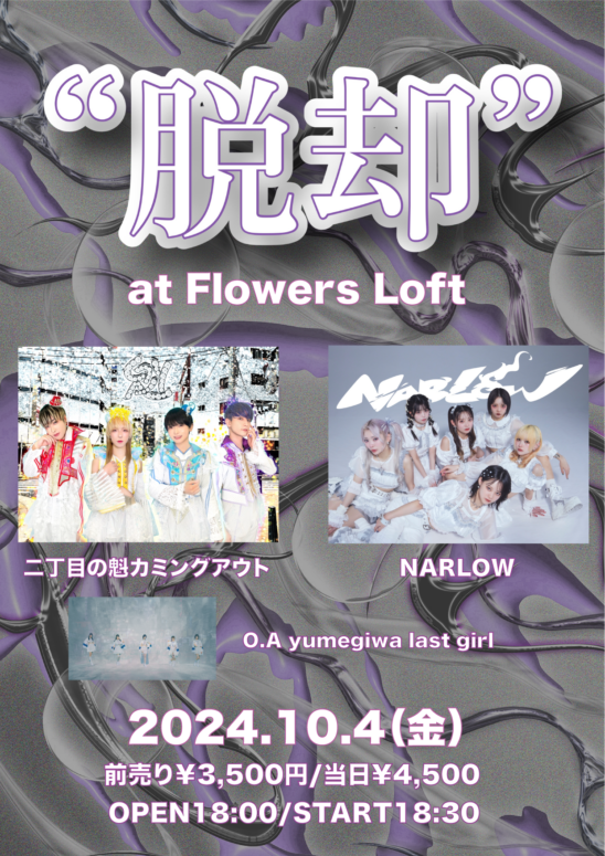 SCHEDULE 2024 10 04 Friday 脱却 Tweet 出演: NARLOW 二丁目の魁カミングアウト O.A yumegiwa last girl TICKET前売り¥3,500/当日¥4,500 #NARLOW#二丁目の魁カミングアウト#[O.A] yumegiwa last girl Share