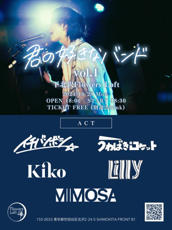 SCHEDULE 2024 10 28 Monday Flowers Loft presents 『君の好きなバンド』vol.1 Tweet イチバンボシ うわばきロケット Kiko Lilly Mimosa TICKETOPEN 18:00 / START 18:30 ADV / DOOR ¥0(+2D ¥1200) #イチバンボシ#うわばきロケット#Kiko#Lilly#Mimosa Share このイベントの予約は締めきりました。