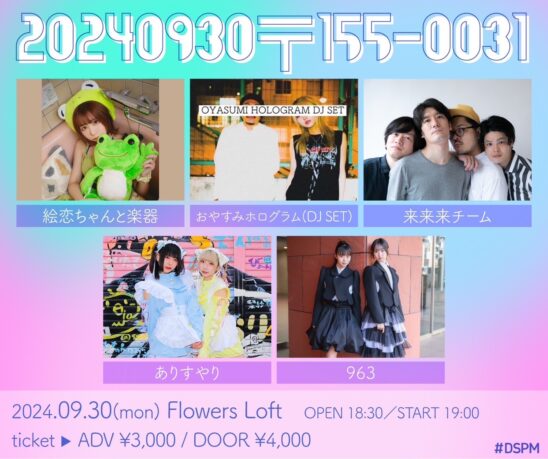 SCHEDULE 2024 09 30 Monday 20240930〒155-0031 OPEN 18:30 - START 19:00 Tweet 絵恋ちゃんと楽器 おやすみホログラム(DJ SET) 来来来チーム ありすやり 963 TICKETADV ¥3,000 / DOOR ¥4,000(+1D) 【TICKET】 zaiko(8/31 12:00〜) #絵恋ちゃんと楽器#[DJ SET] おやすみホログラム#来来来チーム#ありすやり#963 Share