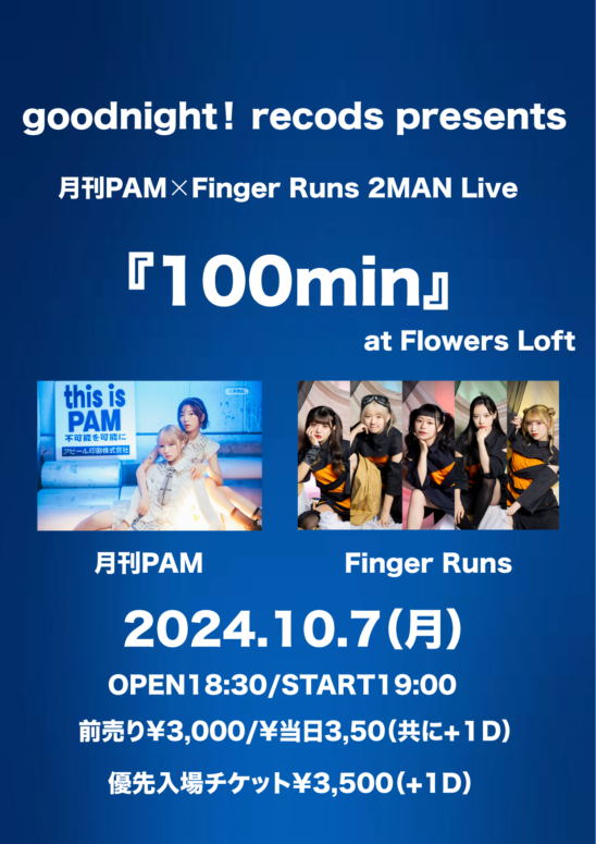 SCHEDULE 2024 10 07 Monday goodnight! records presents 月刊PAM × Finger Runs 2MAN LIVE 【100min】 OPEN 18:30 - START 19:00 Tweet 出演: 月刊PAM Finger Runs TICKET前売3,000円 優先入場チケット3,500円 当日3,500円 #月刊PAM#Finger Runs Share