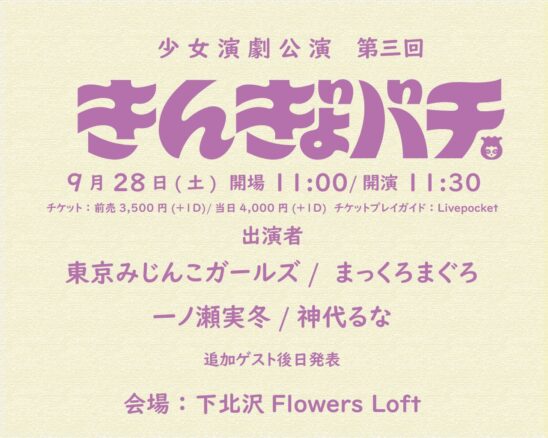 SCHEDULE 2024 09 28 Saturday DAY EVENT 宍戸留美プロデュース 少女演劇公演『きんぎょバチ』第3回 OPEN 11:00 - START 11:30 Tweet 【出演】 出演: 東京みじんこガールズ まっくろまぐろ 一ノ瀬実冬 神代るな TICKET前売 3,500円(+1D) / 当日4,000円(+1D) 発売日:9/7(土)12時〜Livepocketで発売 https://t.livepocket.jp/e/jp069 #東京みじんこガールズ#まっくろまぐろ#一ノ瀬実冬#神代るな Share