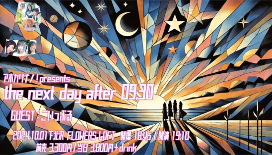 SCHEDULE 2024 10 01 Tuesday アポカリナノ!presents the next day after 09.30 OPEN 18:45 - START 19:10 Tweet 出演: アポカリナノ! ごいっぷる TICKET前売3,300円 / 当日3,800円 + Drink https://t.livepocket.jp/e/thenextdayof0930 #アポカリナノ!#ごいっぷる Share