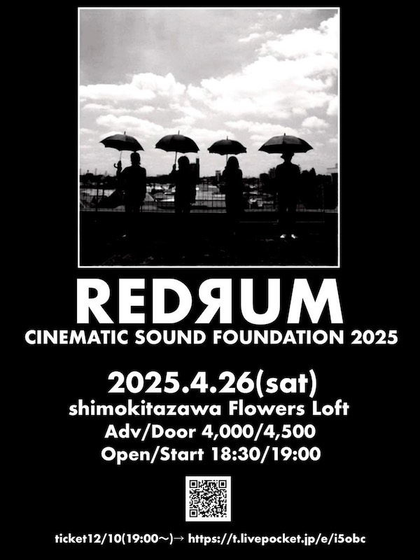 SCHEDULE 2025 04 26 Saturday REDЯUM CINEMATIC SOUND FOUNDATION 2025 OPEN 18:30 - START 19:00 Tweet 出演: REDЯUM TICKET前売り ¥4,000 ・ 当日 ¥4,500 (別途1D) LivePocketにて、12/10(火)19:00より一般発売開始 https://t.livepocket.jp/e/i5obc ツイキャスプレミアムライブアーカイヴ販売中 https://twitcasting.tv/flowers_loft/movie/815484008 #REDЯUM Share