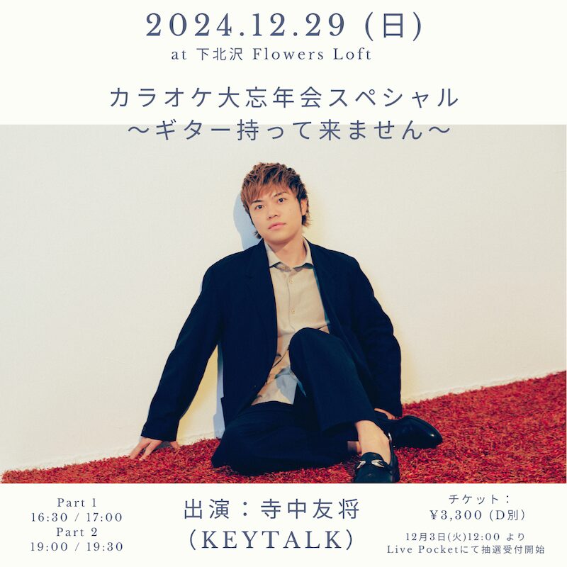 SCHEDULE 2024 12 29 Sunday カラオケ大忘年会スペシャル 〜ギター持って来ません〜 Tweet 出演: 寺中友将(KEYTALK) TICKETPart 1 OPEN 16:30 START 17:00 Part2 OPEN 19:00 START 19:30 チケット: THANK YOU SOLD OUT!!! 一般チケット、当日券の販売はございません #寺中友将 Share