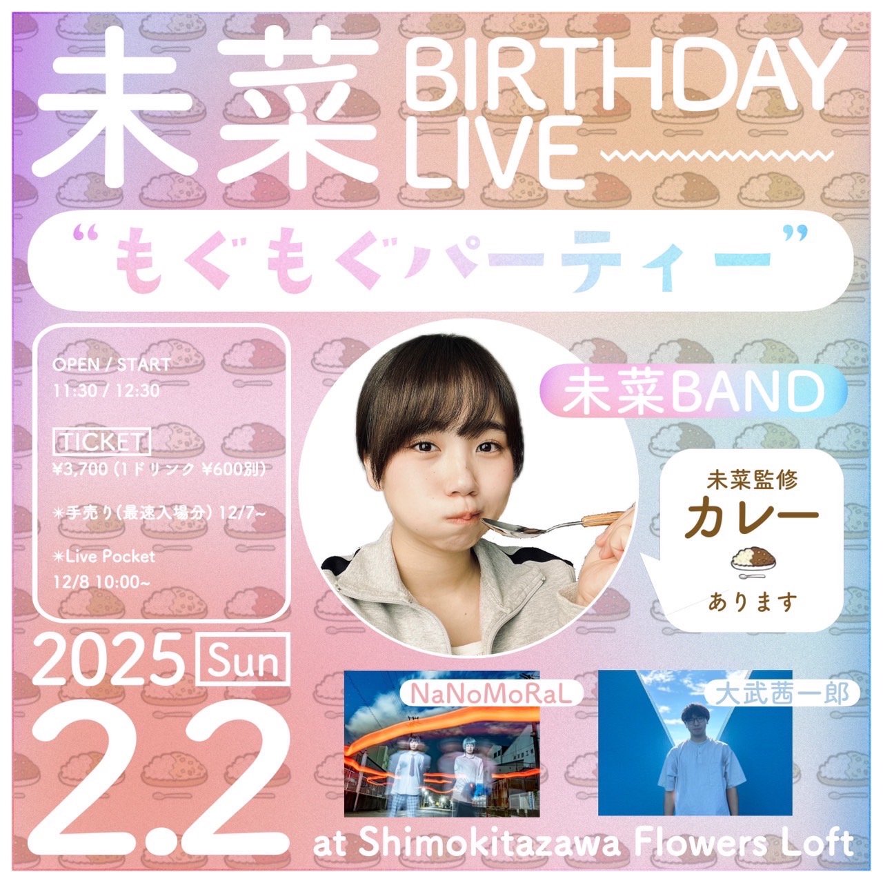 SCHEDULE 2025 02 02 Sunday DAY EVENT 未菜バースデーライブ もぐもぐパーティー OPEN 11:30 - START 12:30 Tweet 未菜BAND NaNoMoRaL 大武茜一郎 TICKETADV ¥3,700 / DOOR 未定(+1D¥600) ★★ THANK YOU SOLDOUT★★ 【TICKET】 手売りチケット(12/7〜販売開始) LivePocket(12/8 10:00〜) 【入場順】 ①手売りチケット(No,1〜)②LivePocket(A No,1〜) #未菜BAND#NaNoMoRaL#大武茜一郎 Share