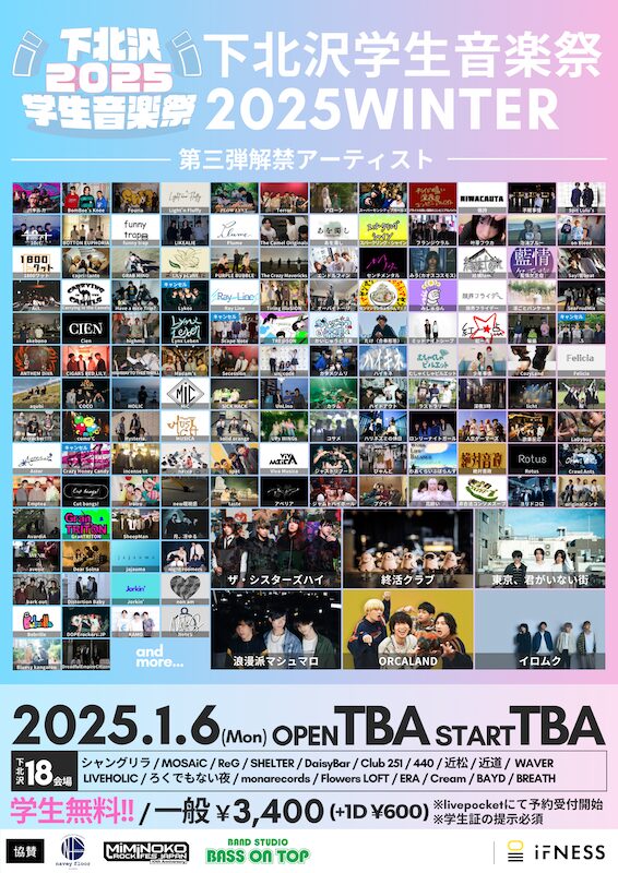 会場:MOSAiC / CLUB 251 / 440 / ReG / LIVEHOLIC / ろくでもない夜 / WAVER / mona rechords / ERA / Flowers Loft / BREATH / 近松 / 近道 / Cream / BAYD / SHELTER / Daisy bar / Shangri-La