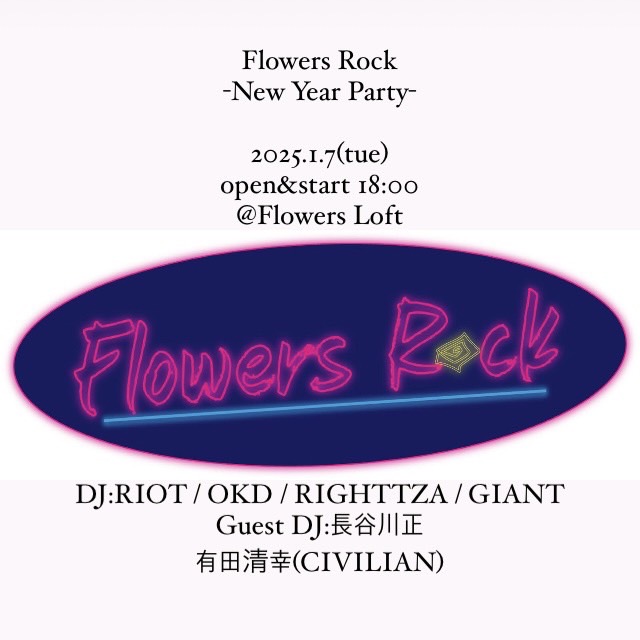 SCHEDULE 2025 01 07 Tuesday Flowers Rock -New Year Party- OPEN 18:00 - START 18:00 Tweet DJ:RIOT / OKD / RIGHTTZA / GIANT Guest DJ:長谷川正 有田清幸(CIVILIAN) &more TICKETday. ¥2000(+1drink¥600) #RIOT#OKD#RIGHTTZA#GIANT#長谷川正#有田清幸(CIVILIAN) Share