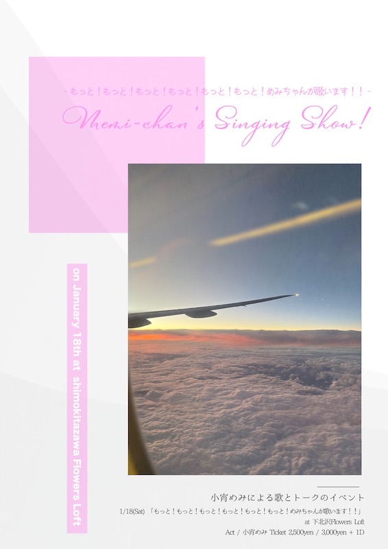 SCHEDULE 2025 01 18 Saturday DAY EVENT もっと!もっと!もっと!もっと!もっと!もっと!めみちゃんが歌います!! OPEN 11:30 - START 12:00 Tweet 出演/小宵めみ TICKETチケット代 2,500円/3,000円+1D ファンクラブ先行抽選: 12/22(日)13:30~12/26(木)23:59まで 一般発売:12/28(土)10:00先着 一般チケット販売URL:https://t.livepocket.jp/e/memi_solo10 #小宵めみ Share