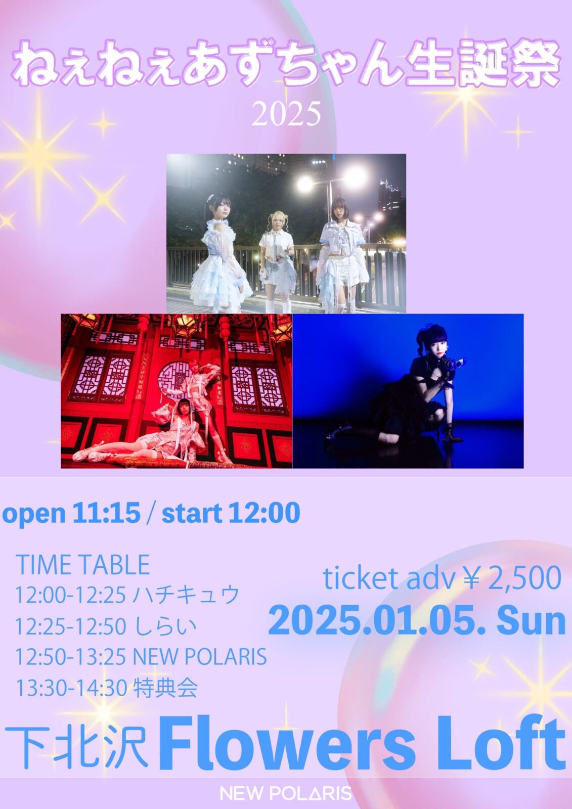 SCHEDULE 2025 01 05 Sunday DAY EVENT ねぇねぇあずちゃん生誕祭 OPEN 11:15 - START 12:00 Tweet NEW POLARIS しらい ハチキュウ TICKET前売 S¥5,500(優先入場・あず生誕特典付)/A¥2,500(各+1D) http://t.livepocket.jp/e/20250105 #NEW POLARIS Share