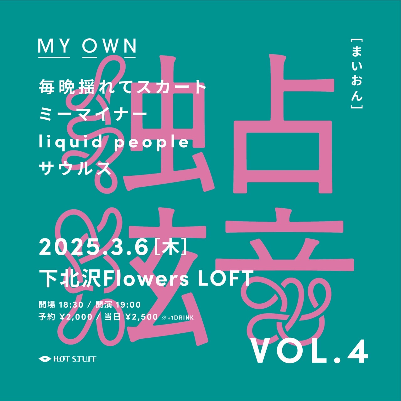 SCHEDULE 2025 03 06 Thursday 独占絃音 -my own- VOL.4 OPEN 18:30 - START 19:00 Tweet 毎晩揺れてスカート ミーマイナー liquid people サウルス TICKETADV ¥2,000 / DOOR ¥2,500(+1D¥600) 【TICKET】 Livepocket(〜2025/3/5 23:59まで) #毎晩揺れてスカート#ミーマイナー#liquid people#サウルス Share