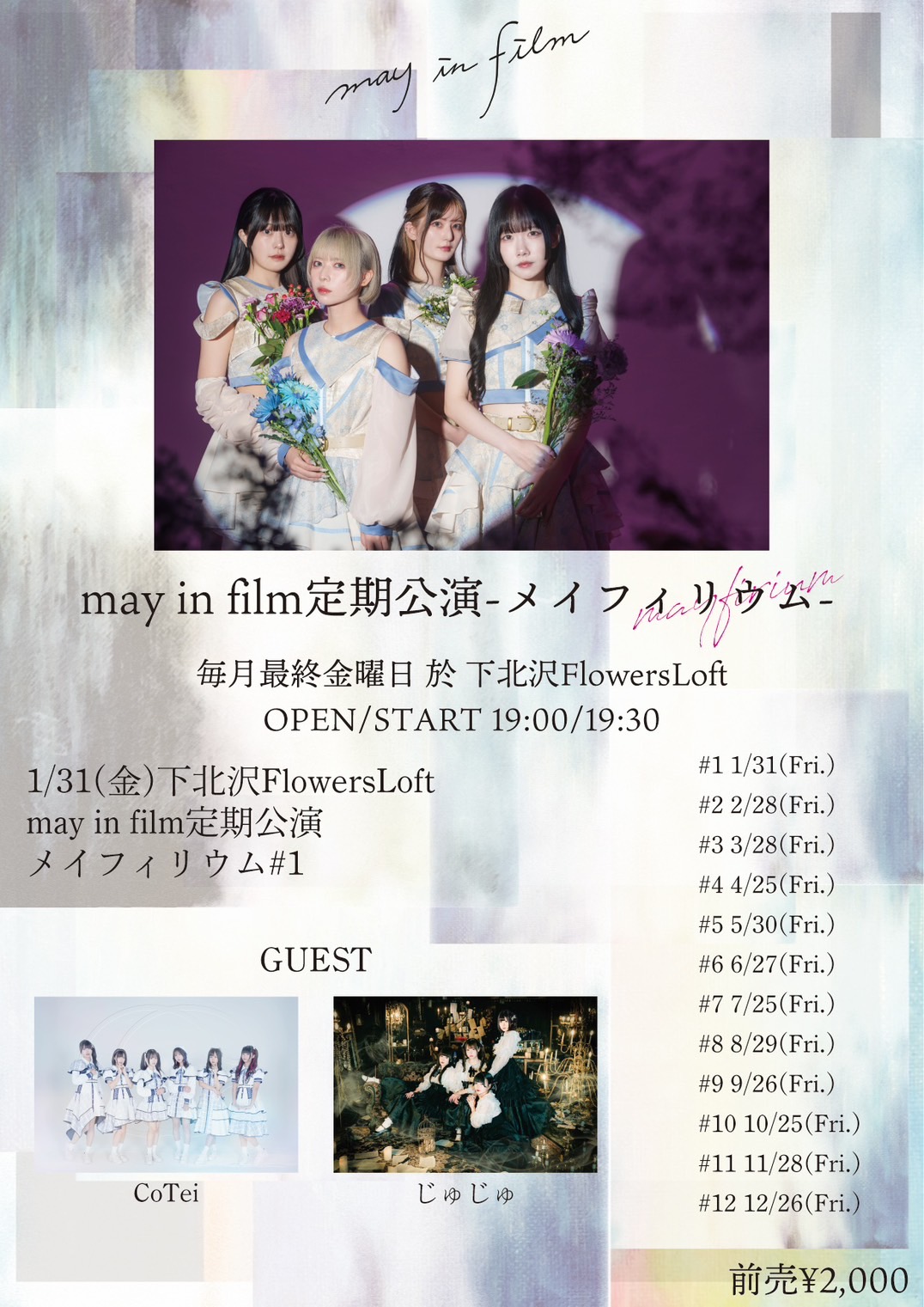 SCHEDULE 2025 01 31 Friday may in film定期公演 メイフィリウム#1 OPEN 19:00 - START 19:30 Tweet 出演: may in film CoTei じゅじゅ TICKET前売り¥2,000/当日¥2,500 チケットURL→ https://t.livepocket.jp/e/mayfirium_1 #may in film#CoTei#じゅじゅ Share