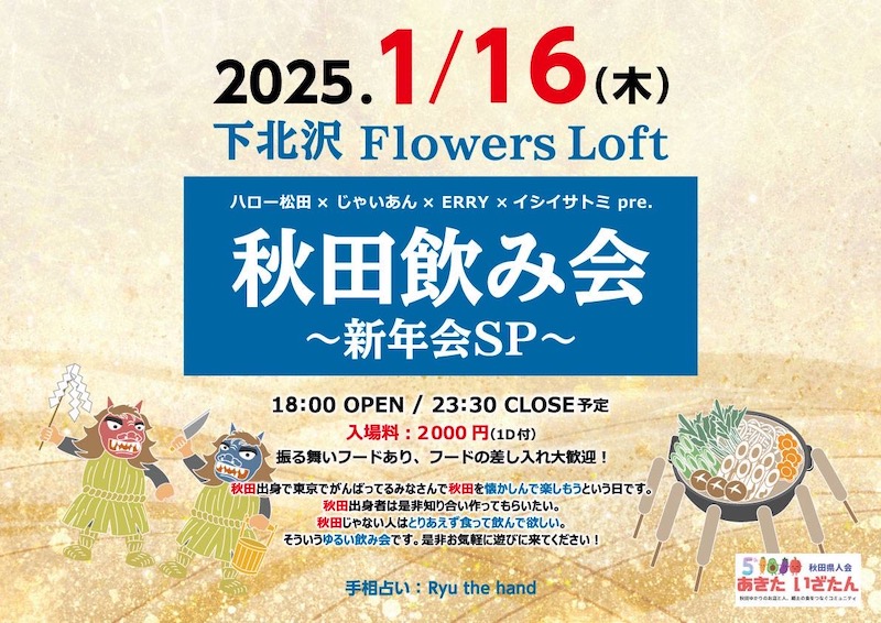SCHEDULE 2025 01 16 Thursday ハロー松田 x じゃいあん x ERRY x イシイサトミ pre. 秋田飲み会〜新年会SP〜 OPEN 18:00 - START 18:00 Tweet DJ & 飛び入り弾き語りあり TICKET入場料:2000円(1D付) Share