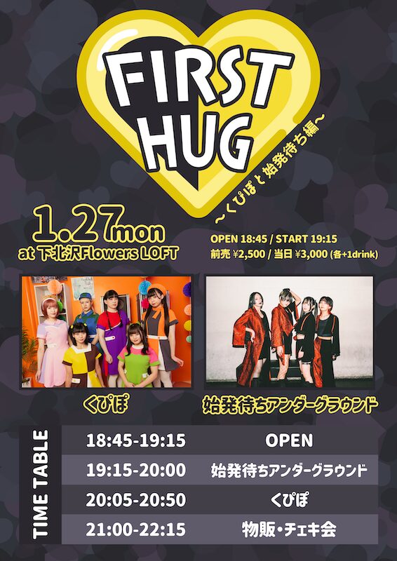 SCHEDULE 2025 01 27 Monday FIRST HUG~くぴぽと始発待ち編~ OPEN 18:45 - START 19:15 Tweet 出演: くぴぽ 始発待ちアンダーグラウンド TICKET前売/当日:2,500円/3,000円(共に+1drink) 【チケット販売開始:2025/01/18(土)22:00】 https://t.livepocket.jp/e/ldehk チケット販売期間 2025/01/18(土)22:00-2025/01/27(月)16:00 [※コンビニ支払いは2025/01/26(日)23:59まで] #くぴぽ#始発待ちアンダーグラウンド Share