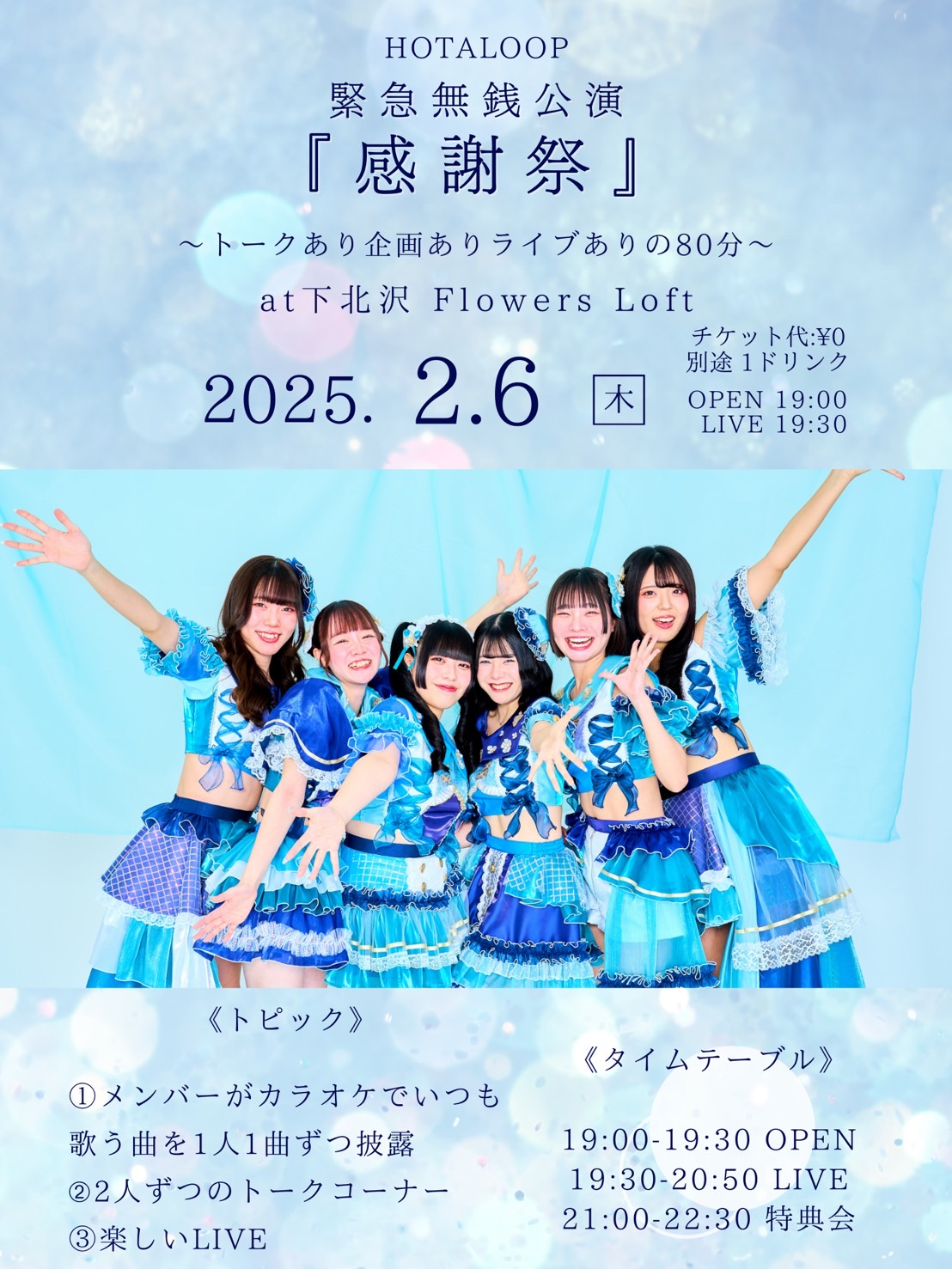 SCHEDULE 2025 02 06 Thursday HOTALOOP 緊急無銭公演 『感謝祭』 OPEN 19:00 - START 19:30 Tweet 出演: HOTALOOP TICKET前売 0円 / 当日 1,000円 (各+1D600円) ※ドリンク代600円はチケット予約時にお支払いいただきます。 《チケット》 https://t.livepocket.jp/e/kansya #HOTALOOP Share