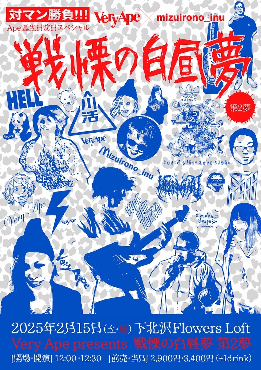 SCHEDULE 2025 02 15 Saturday DAY EVENT Very Ape presents 「戦慄の白昼夢 -第2夢-」 OPEN 12:00 - START 12:30 Tweet Very Ape mizuirono_inu TICKETADV¥2900 / DOOR¥3400(DRINK代別¥600) [発売] 予約フォームより↓ https://veryape.net/ #Very Ape#mizuirono_inu Share