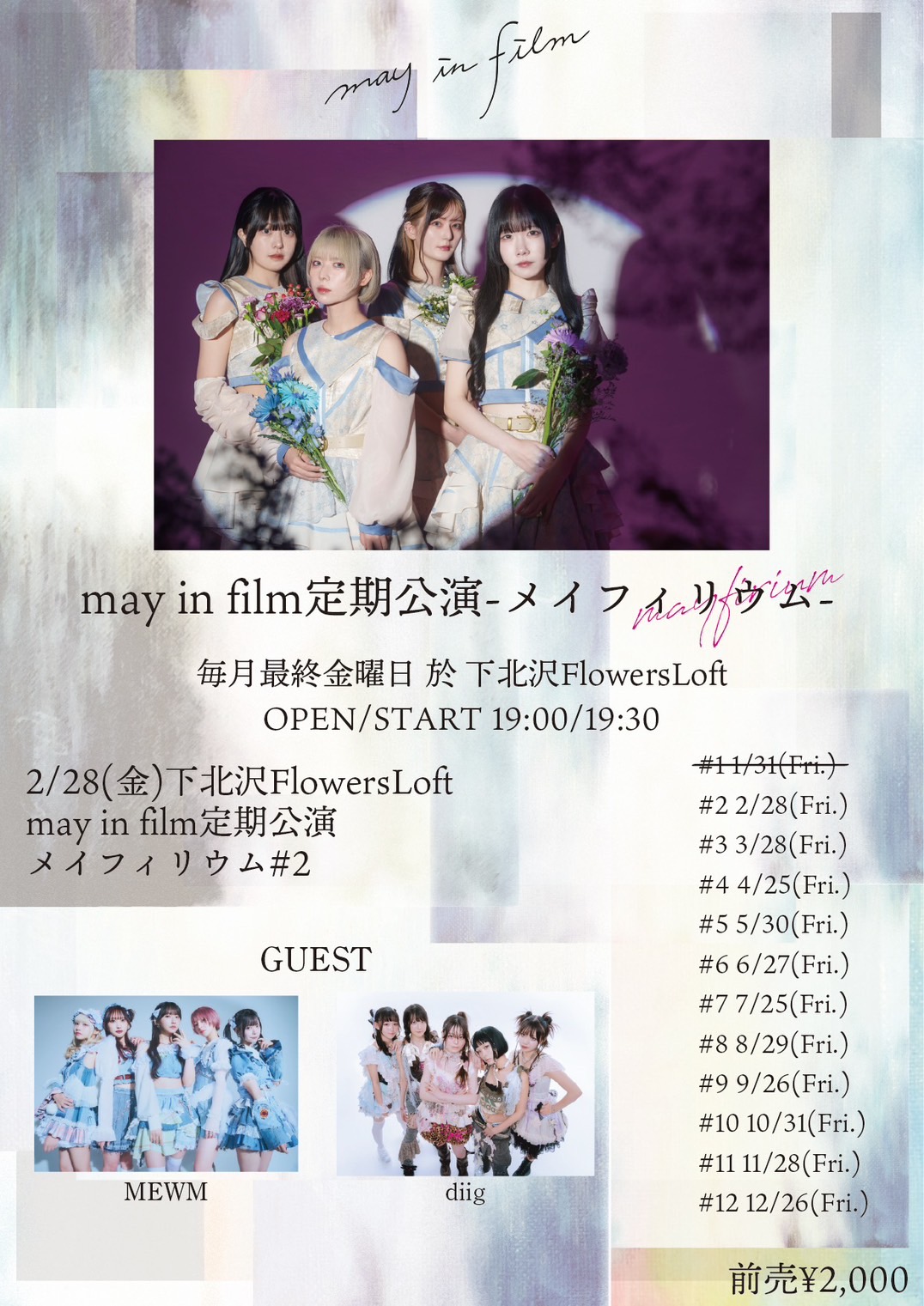 SCHEDULE 2025 02 28 Friday may in film定期公演 「メイフィリウム#2」 OPEN 19:00 - START 19:30 Tweet 【出演】 may in film MEWM diig TICKET【料金】前売¥2,000 当日券¥2,500 https://t.livepocket.jp/e/mayfirium_2 ※2/15(土)22:00〜 #may in film#diig#MEWM Share