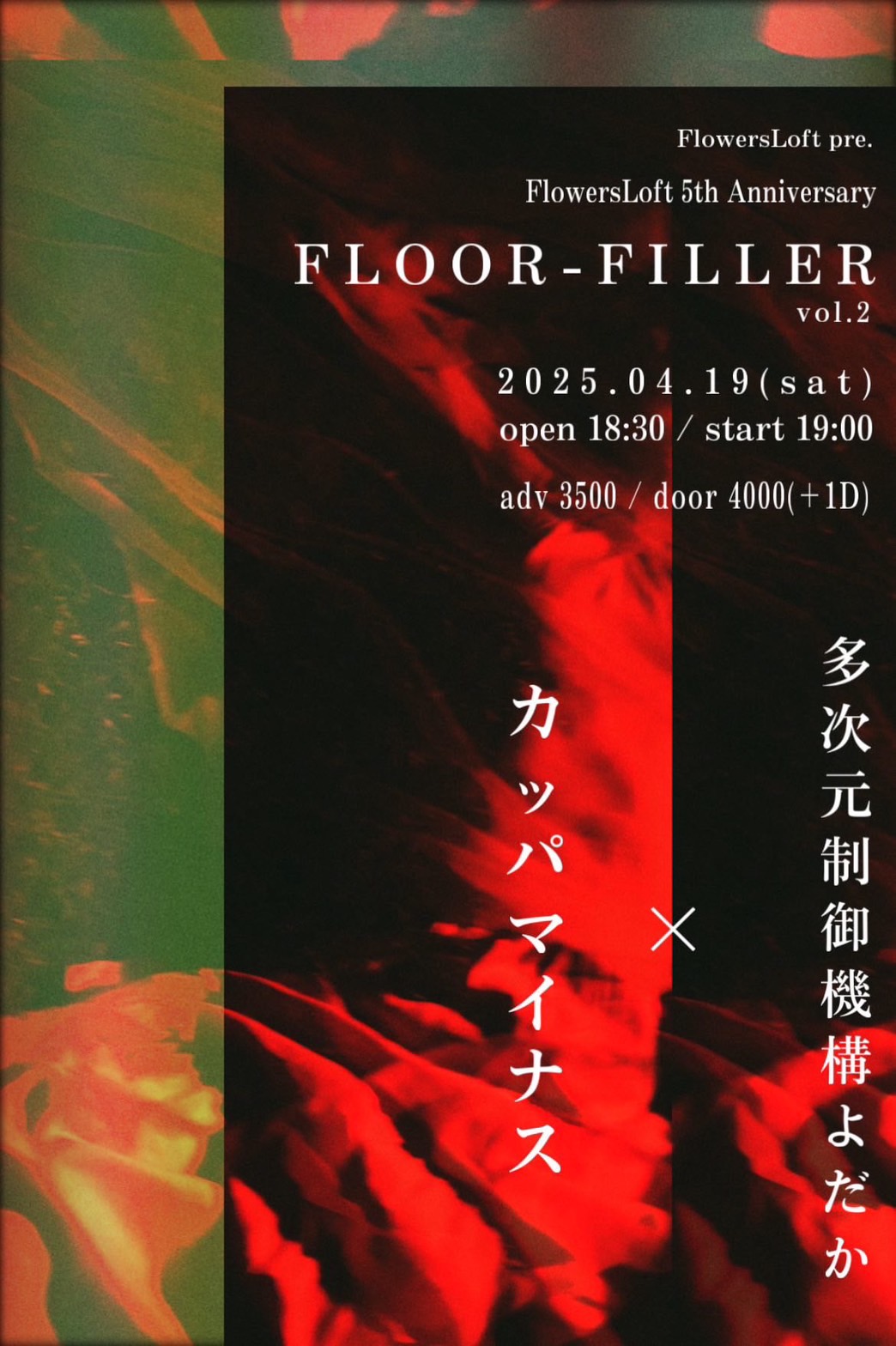 SCHEDULE 2025 04 19 Saturday FlowersLoft pre.FlowersLoft 5th Anniversary 「FLOOR-FILLER vol.2」 OPEN 18:30 - START 19:00 Tweet 多次元制御機構よだか カッパマイナス TICKETADV ¥3,500 / DOOR ¥4,000(+1D) 【TICKET】 e+一般発売(2025/2/22 10:00〜) #多次元制御機構よだか#カッパマイナス Share
