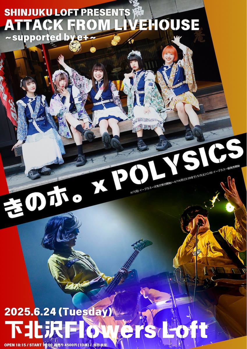 SCHEDULE 2025 06 24 Tuesday SHINJUKU LOFT PRESENTS 『ATTACK FROM LIVEHOUSE』supported by e+ OPEN 18:15 - START 19:00 Tweet きのホ。 POLYSICS TICKETADV¥4500 / DOOR 未定(DRINK代別¥600) [発売] eplusプレオーダー 4月7日(月)18:00〜4月14日(月)23:59まで eplus一般 5月3日(土)12:00〜 https://eplus.jp/attackfromlivehouse/ 【入場順】 ①e+プレオーダー(A)No.1〜 ②e+一般発売(B)No.1〜 ③当日券 #きのホ。#POLYSICS Share