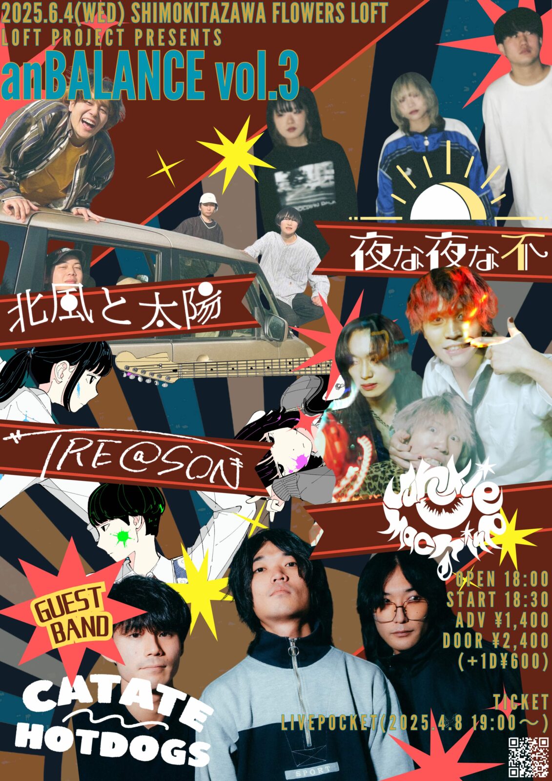 SCHEDULE 2025 06 04 Wednesday LOFT PROJECT presents 『anBALANCE vol.3』 OPEN 18:00 - START 18:30 Tweet 北風と太陽 夜な夜な不 Junkie Machine TRE@SON GUEST BAND:CAT ATE HOTDOGS TICKETADV ¥1,400 / DOOR ¥2,400(+1D) 【TICKET】 LivePocket(2025/4/8 19:00〜2025/6/3 23:59) 出演者予約 【入場順】 ①LivePocket②出演者予約 Share