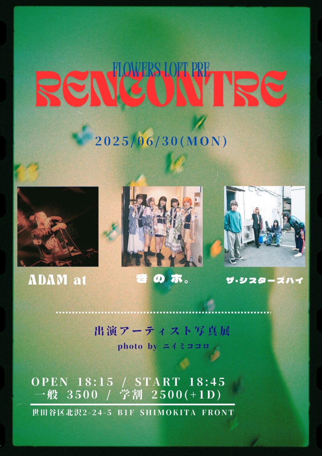 SCHEDULE 2025 06 30 Monday FLOWERS LOFT PRE. 「RENCONTRE」 OPEN 18:15 - START 18:45 Tweet ADAM at きのホ。 ザ・シスターズハイ TICKETADV ¥3,500 / DOOR ¥4,000 / 学割 ¥2,500(+1D) 【TICKET】 e+(2025/4/12 12:00~) 【入場順】 ①e+一般発売チケット(学割A No,1〜、一般B No,1〜)※並列入場②当日券 #ADAM at#きのホ。#ザ・シスターズハイ Share