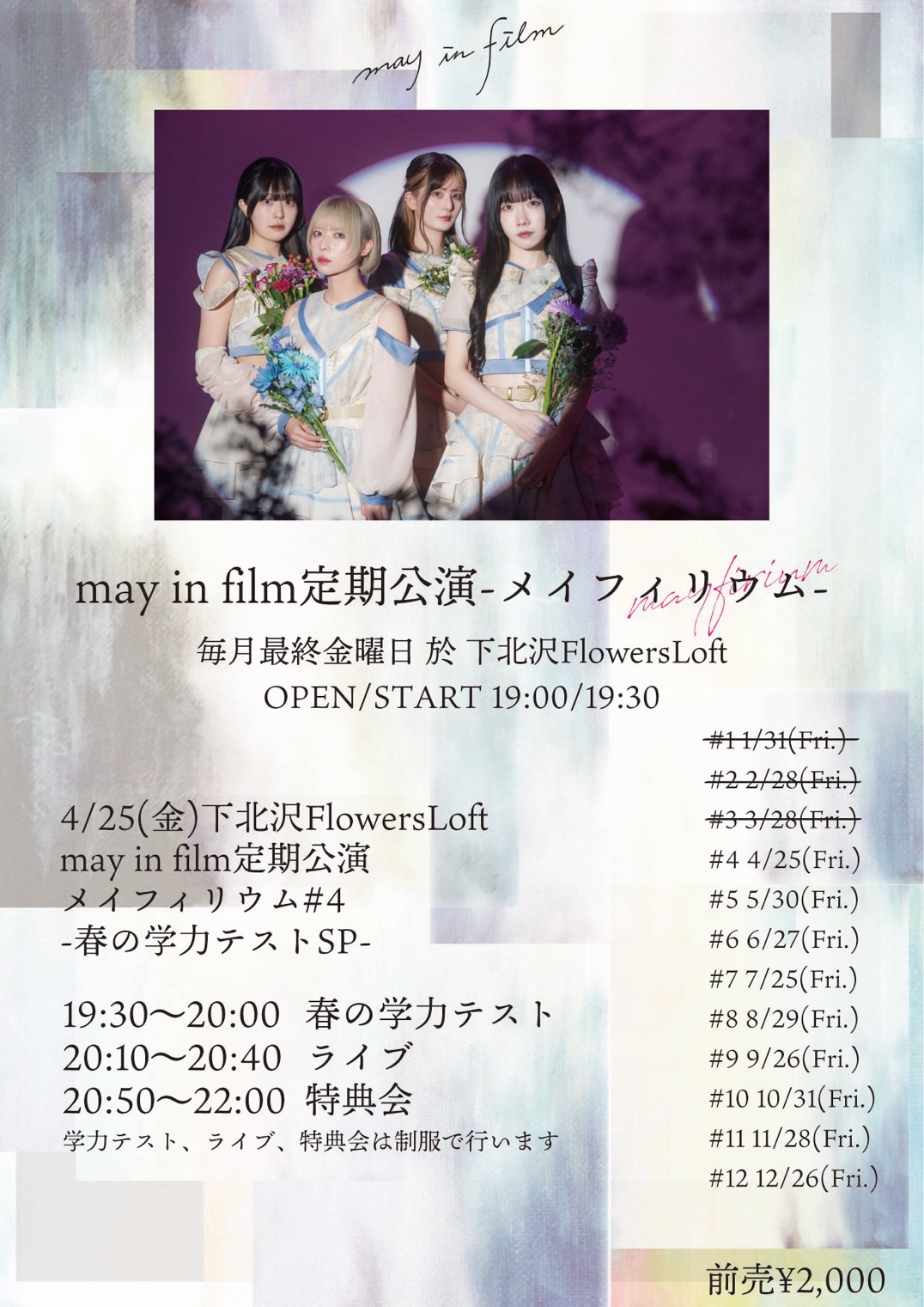 SCHEDULE 2025 04 25 Friday may in film定期公演 メイフィリウム#4-春の学力テストSP- OPEN 19:00 - START 19:30 Tweet 出演: may in film TICKET前売り¥2,000/当日¥2,500 #may in film Share