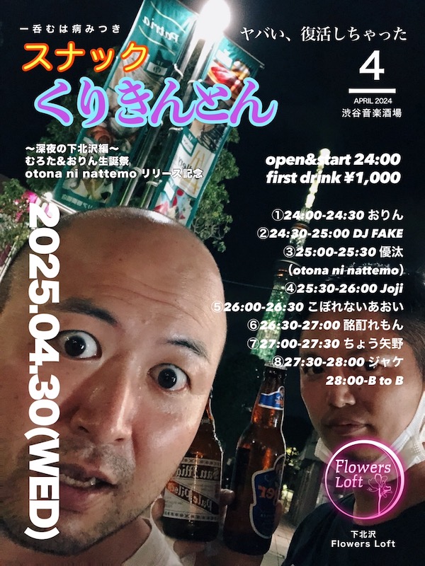 SCHEDULE 2025 04 30 Wednesday MIDNIGHT EVENT BAR スナックくりきんとんvol.3〜深夜の下北沢編〜 むろた&おりん生誕祭 otona ni nattemo リリース記念 OPEN 24:00 - START 24:00 Tweet DJ ジャケ ちょう矢野 こぼれないあおい DJ FAKE おりん Joji 優汰(otona ni nattemo) 酩酊れもん TICKETFIRST DRINK ¥1,000 Share