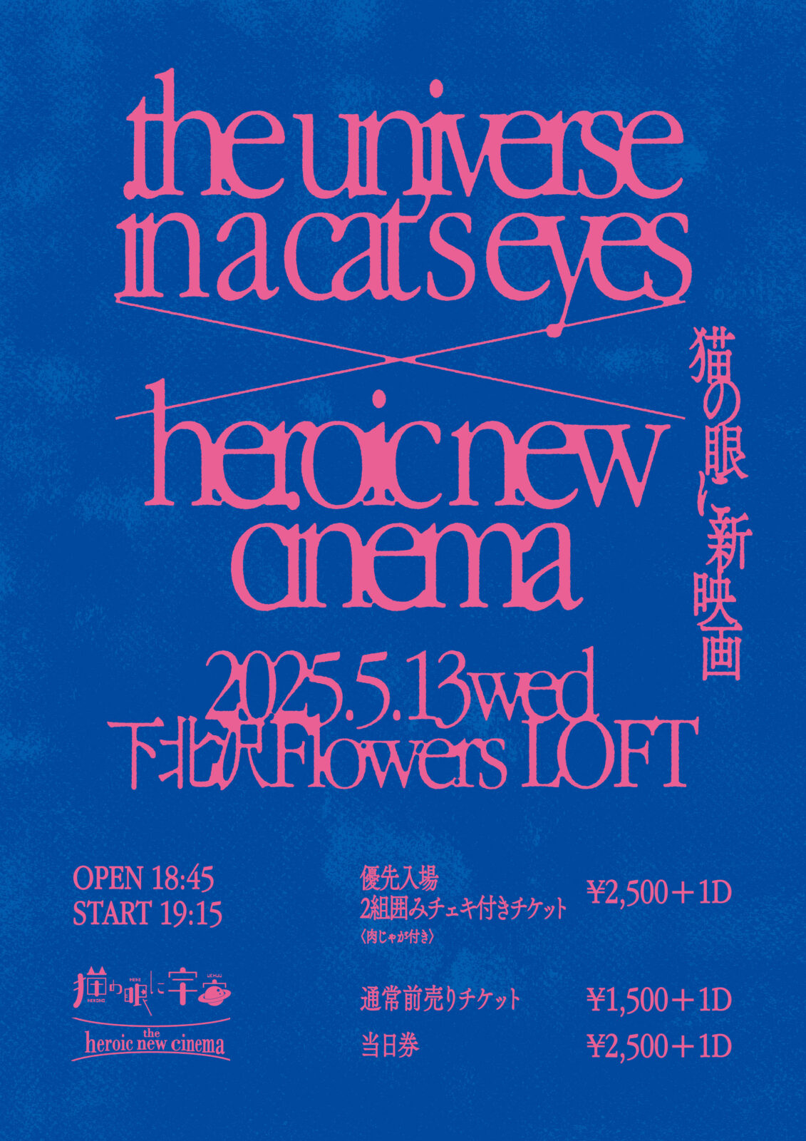 SCHEDULE 2025 05 13 Tuesday 『猫の眼に新映画』 OPEN 18:45 - START 19:15 Tweet 出演 猫の眼に宇宙 ヒロイックニューシネマ TICKET①優先入場2組囲み付きチケット (肉じゃが付き) 2500円+1D ②通常前売チケット1500円 +1D ③当日 2500円+1D https://t.livepocket.jp/e/cateyesnewcinema2025513 (2025年05月06日(火) 12:00 〜 2025年05月12日(月) 23:59) #ヒロイックニューシネマ#猫の眼に宇宙 Share