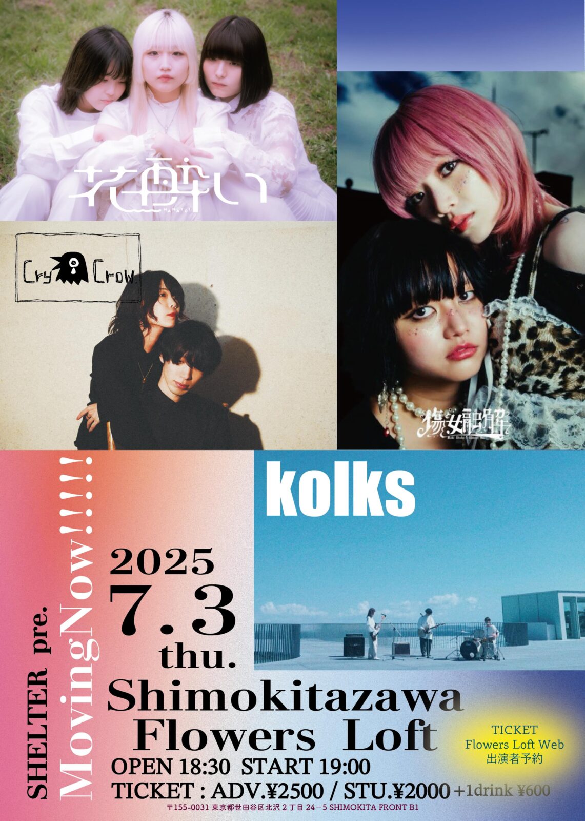 SCHEDULE 2025 07 03 Thursday Shimokitazawa SHELTER presents. MovingNow!!!!! Tweet cry crow. 傷女融解 花酔い kolks TICKETOPEN / START TBA ADV ¥2,500 / 学割 ¥2,000 / DOOR ¥3,000(+1D) ※学割チケットご購入のお客様は当日学生証提示必須 【TICKET】 Flowers LOFT HP予約、各出演者予約 #cry crow.#傷女融解#花酔い#kolks Share このイベントの予約は締めきりました。