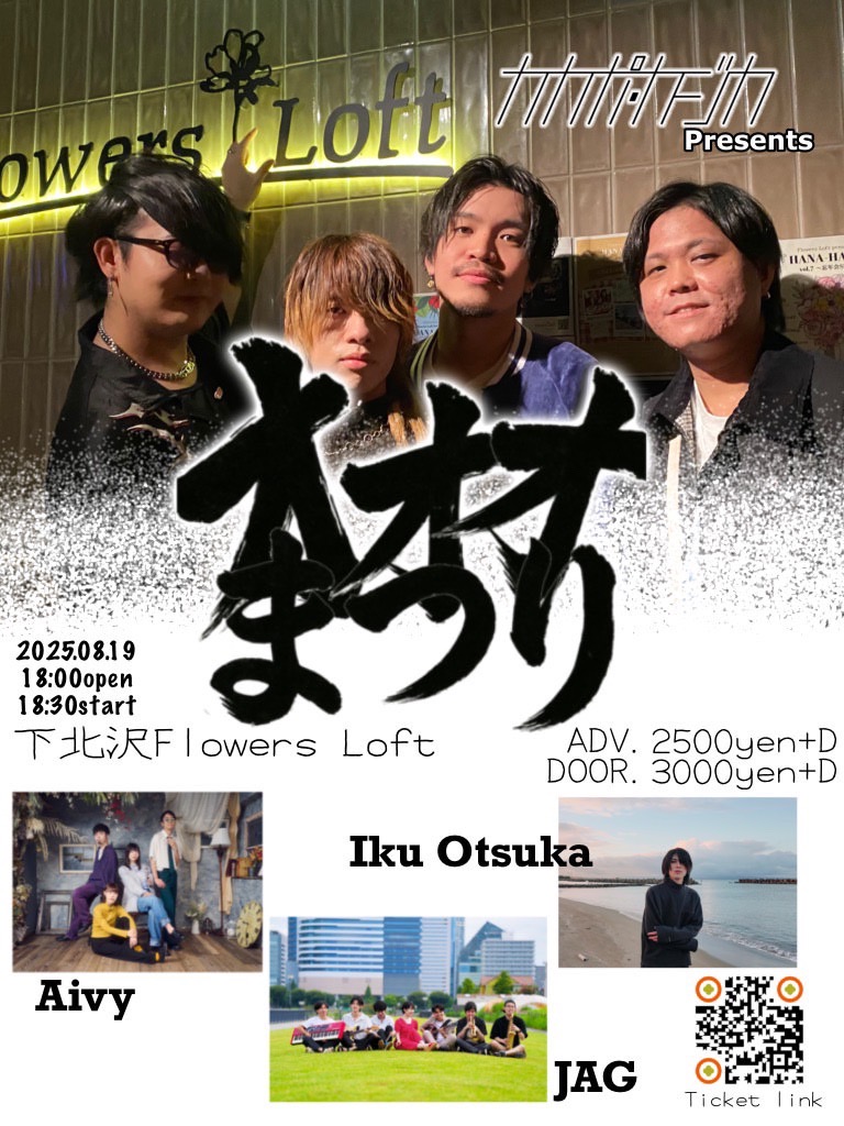 SCHEDULE 2025 08 19 Tuesday カカポカジカ presents 『オオオまつり』 OPEN 18:00 - START 18:30 Tweet カカポカジカ Aivy JAG 大塚 育 TICKETADV ¥2,500 / DOOR ¥3,000(+1D) 【TICKET】 LivePocket(2025/6/20 20:00~2025/8/18 23:59) #カカポカジカ#Aivy#JAG#大塚 育 Share