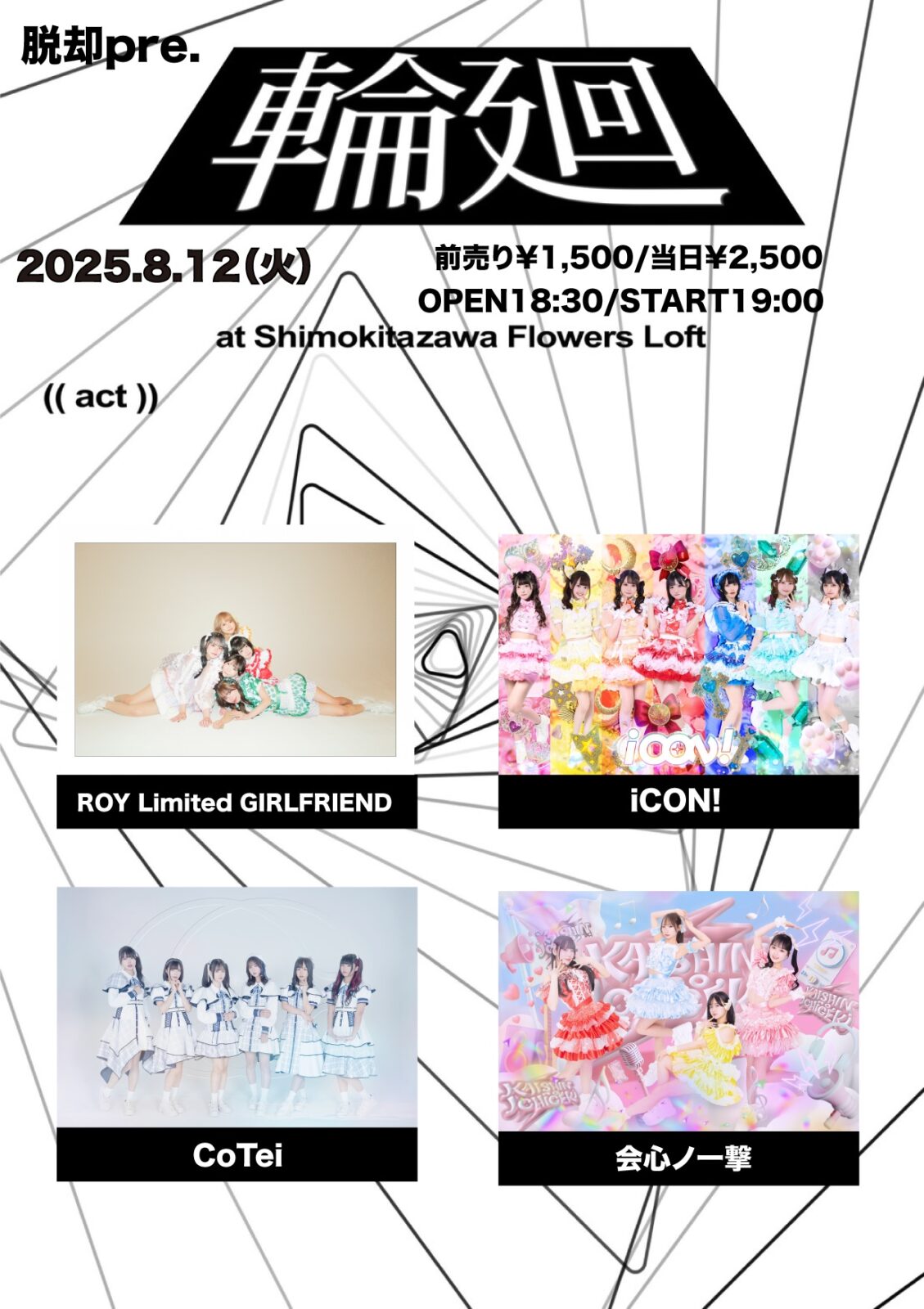 SCHEDULE 2025 08 12 Tuesday 脱却pre.『輪廻』 OPEN 18:30 - START 19:00 Tweet 出演: iCON! CoTei 会心ノ一撃 ROY Limited GIRLFRIEND TICKETチケット代: 前売り¥1,500/当日¥2,500 チケット発売日 7月24日 20:00~ チケットURL:https://t.livepocket.jp/e/f02uc #iCON!#会心ノ一撃#ROY Limited GIRLFRIEND#CoTei Share