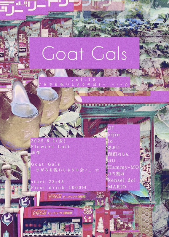 SCHEDULE 2025 08 01 Friday MIDNIGHT EVENT BAR Goat Gals vol.10 〜かがちお祝いしようの会^_−☆〜 OPEN 23:30 - START 23:45 Tweet DJ: kijin io あおい 酩酊れもん れい Hammy-MO かち割れ kensei doi MARIO TICKETFirst drink 1000円 Share