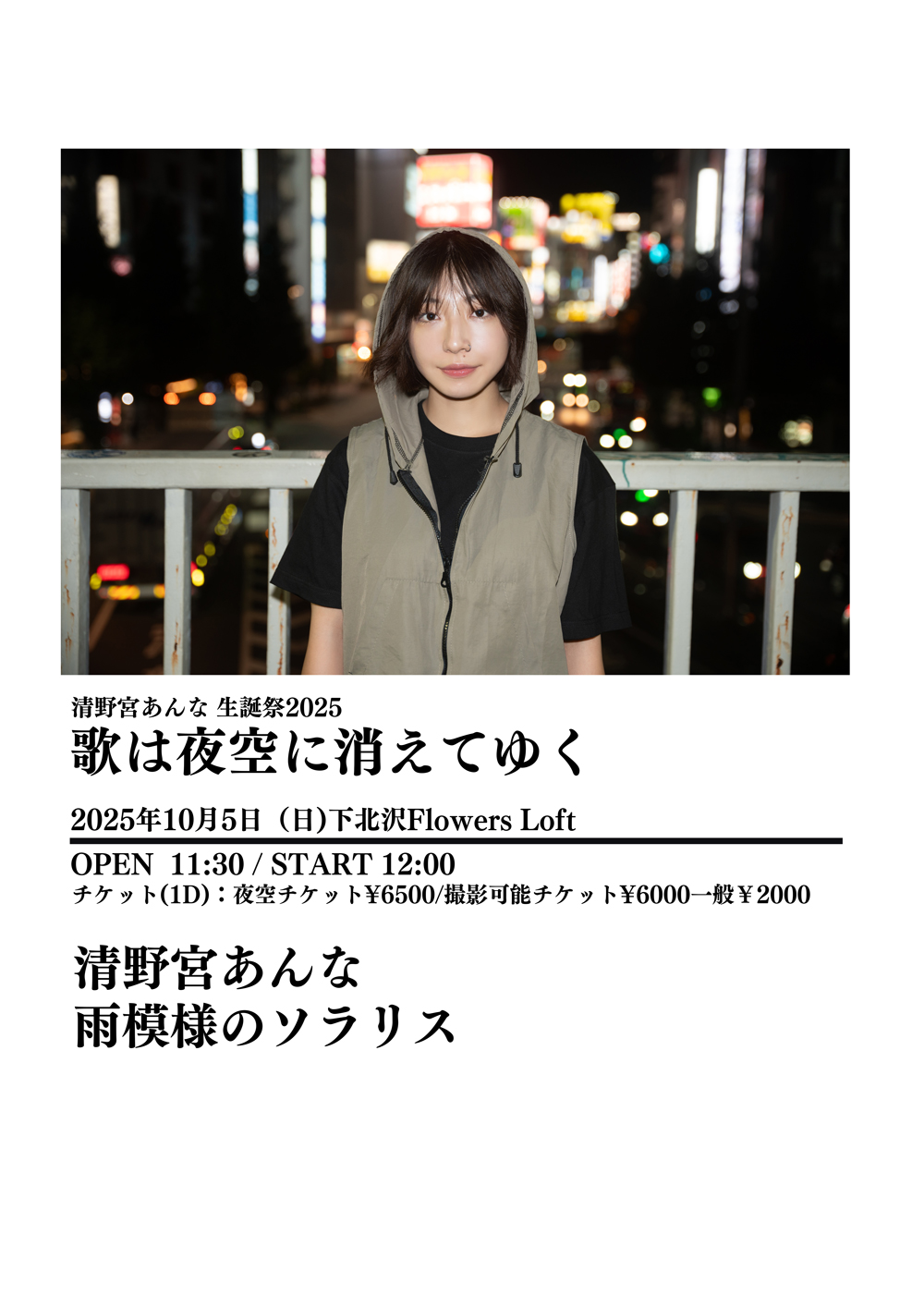 SCHEDULE 2025 10 05 Sunday DAY EVENT 清野宮あんな 生誕祭2025〜歌は夜空に消えてゆく〜 OPEN 11:30 - START 12:00 Tweet 出演者: 清野宮あんな 雨模様のソラリス TICKETチケット(+1D): 夜空チケット¥6500(優先入場 / サイン入りポスター付き) 撮影可能チケット¥5000(撮影エリアわけなし / 後方エリアのみ脚立使用可能) 一般チケット¥2000 当日券¥2500 Share