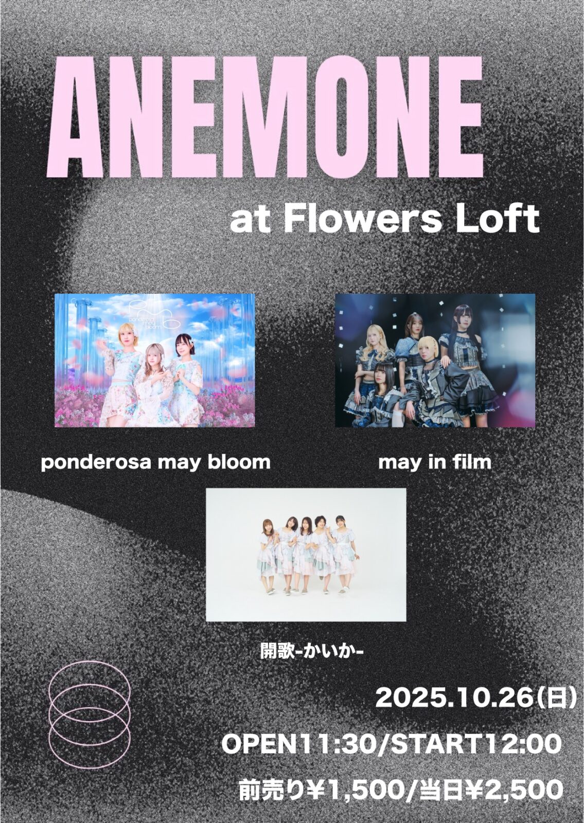 SCHEDULE 2025 10 26 Sunday DAY EVENT 「アネモネ」 OPEN 11:30 - START 12:00 Tweet 出演: may in film ponderosa may bloom 開歌-かいか- TICKET前売り¥1,500 当日¥2,500 チケット発売日:2025年10月7日 22:00~ チケットURL:https://t.livepocket.jp/e/anemone251026 Share