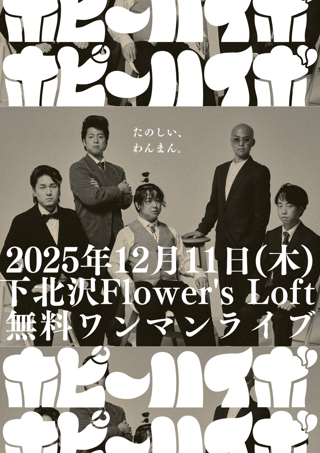 SCHEDULE 2025 12 11 Thursday ホピーハイボ 無料ワンマンライブ ” たのしい、わんまん 。 “ OPEN 19:00 - START 19:30 Tweet ホピーハイボ TICKETADV ¥0 / DOOR ¥1,000(+2D¥1,200) ※2D¥1,200事前支払い制の為、前売り件ご購入済みのお客様は当日は受付でドリンクチケットをお受け取りのみとなります。 【TICKET】 LivePocket(2025/10/22 22:00〜) #ホピーハイボ Share