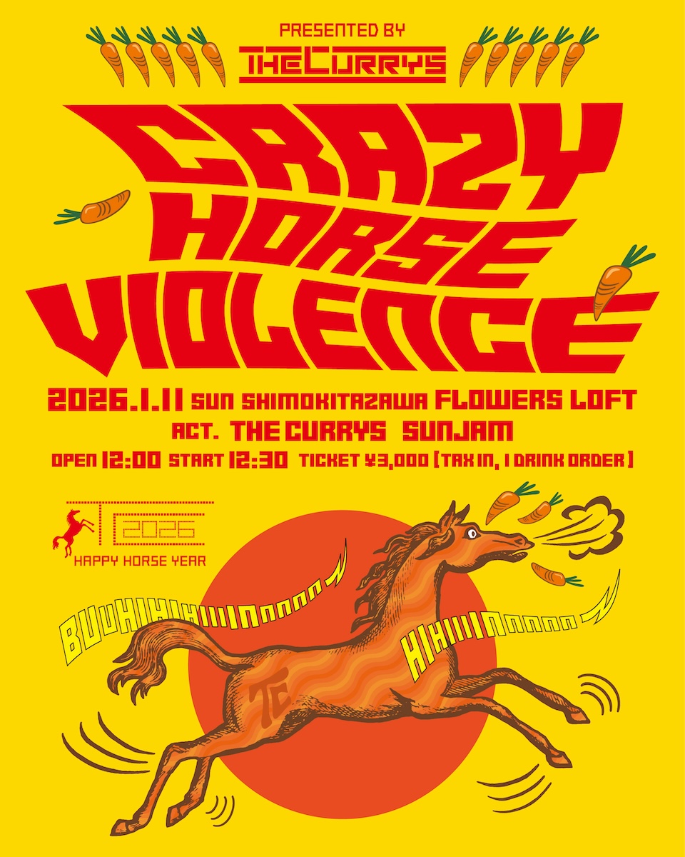 SCHEDULE 2026 01 11 Sunday DAY EVENT CRAZY HORSE VIOLENCE OPEN 12:00 - START 12:30 Tweet ザ・カレーズ SunJAM TICKETADV¥3000 / DOOR 未定(DRINK代別¥600) [発売] eplus 10月27日(月)10:00〜 #ザ・カレーズ#SunJAM Share
