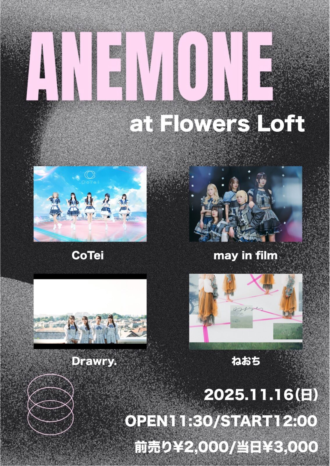 SCHEDULE 2025 11 16 Sunday DAY EVENT アネモネ OPEN 11:30 - START 12:00 Tweet 出演: may in film Drawry. ねおち CoTei TICKETチケットURL:https://t.livepocket.jp/e/anemone3 前売り¥2,500/当日¥3,500 Share
