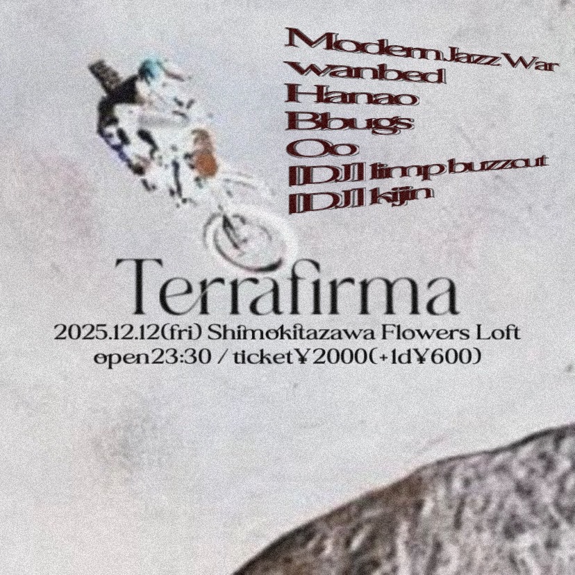 SCHEDULE 2025 12 12 Friday MIDNIGHT EVENT Terrafirma OPEN 23:30 - START 23:30 Tweet [act] Modern Jazz War wanbed Hanao Bbugs Oo [DJ] limp buzzcut kijin TICKET料金:¥2,000(+1d) Share チケット予約