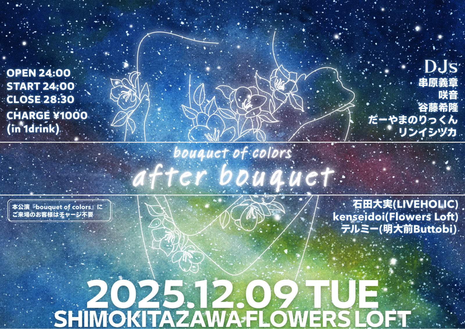 SCHEDULE 2025 12 09 Tuesday MIDNIGHT EVENT bouquet of colors -after bouquet- OPEN 24:00 - START 24:00 Tweet 串原義章 咲音 谷藤希隆 だーやまのりっくん リンイシヅカ 石田大実(LIVEHOLIC) kenseido(Flowers Loft) テルミー(明大前Buttobi) TICKETCHARGE ¥1,000 (1D込) ※夜公演『bouquet of colors』にご来場の方はチャージ不要 Share