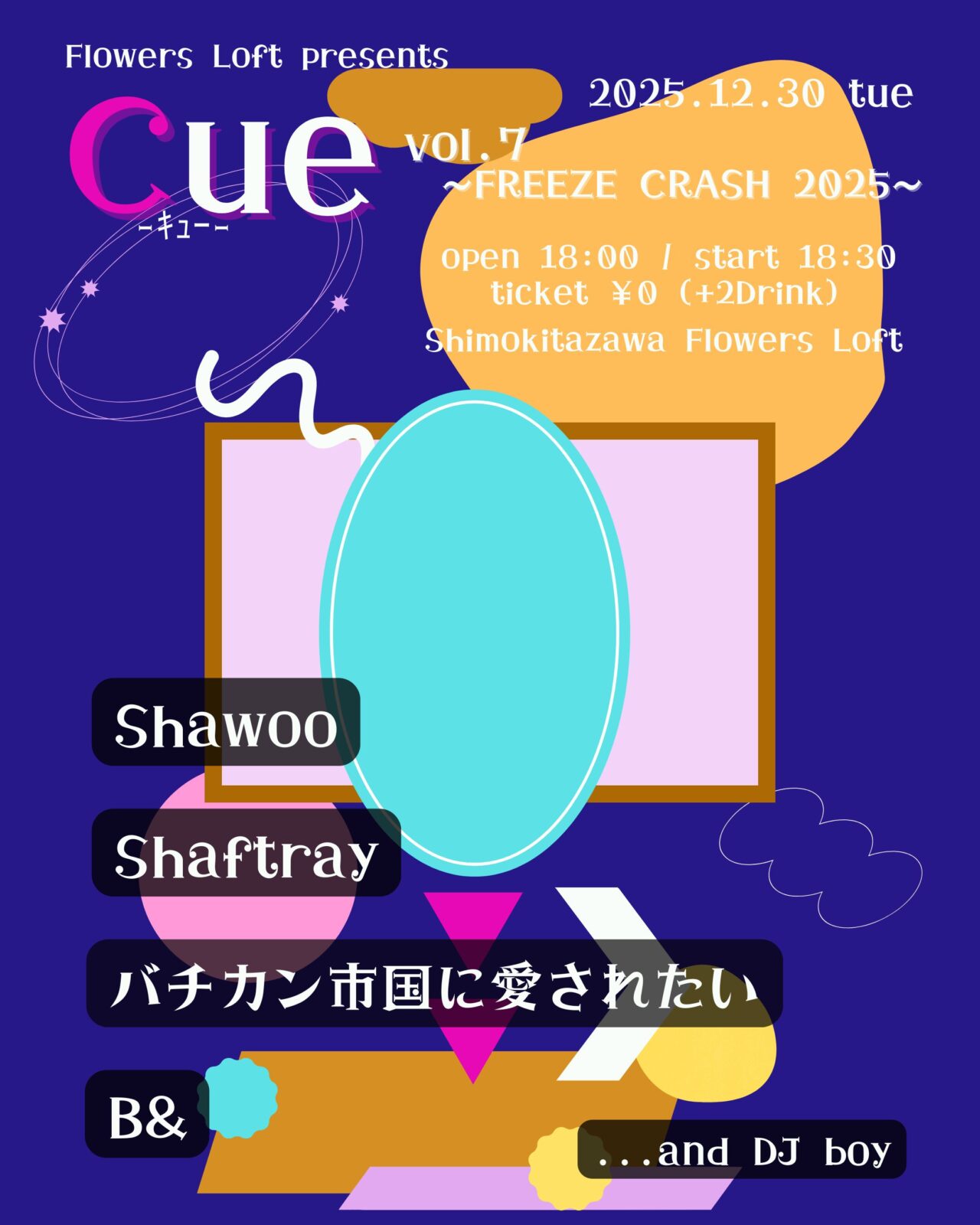 SCHEDULE 2025 12 30 Tuesday Flowers Loft presents 『Cue-キュー- vol.7 – FREEZE CRASH 2025』 OPEN 18:00 - START 18:30 Tweet Shawoo Shaftray バチカン市国に愛されたい B& and DJ Boy TICKETチケット代:¥0 (+2Drink) Share このイベントの予約は締めきりました。