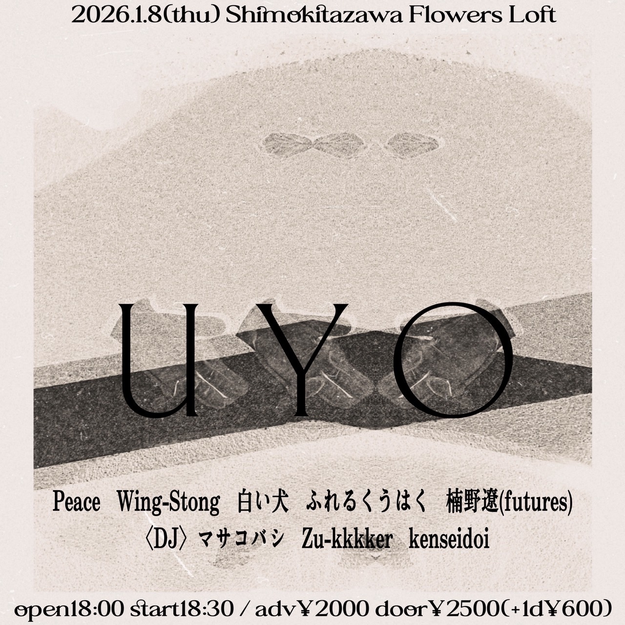 SCHEDULE 2026 01 08 Thursday UYO OPEN 18:00 - START 18:30 Tweet 〈act〉 Peace Wing-Stong 白い犬 ふれるくうはく 楠野遼(futures) DJ マサコバシ Zu -kkkker kenseidoi TICKET¥2,000(+1Drink) Share このイベントの予約は締めきりました。