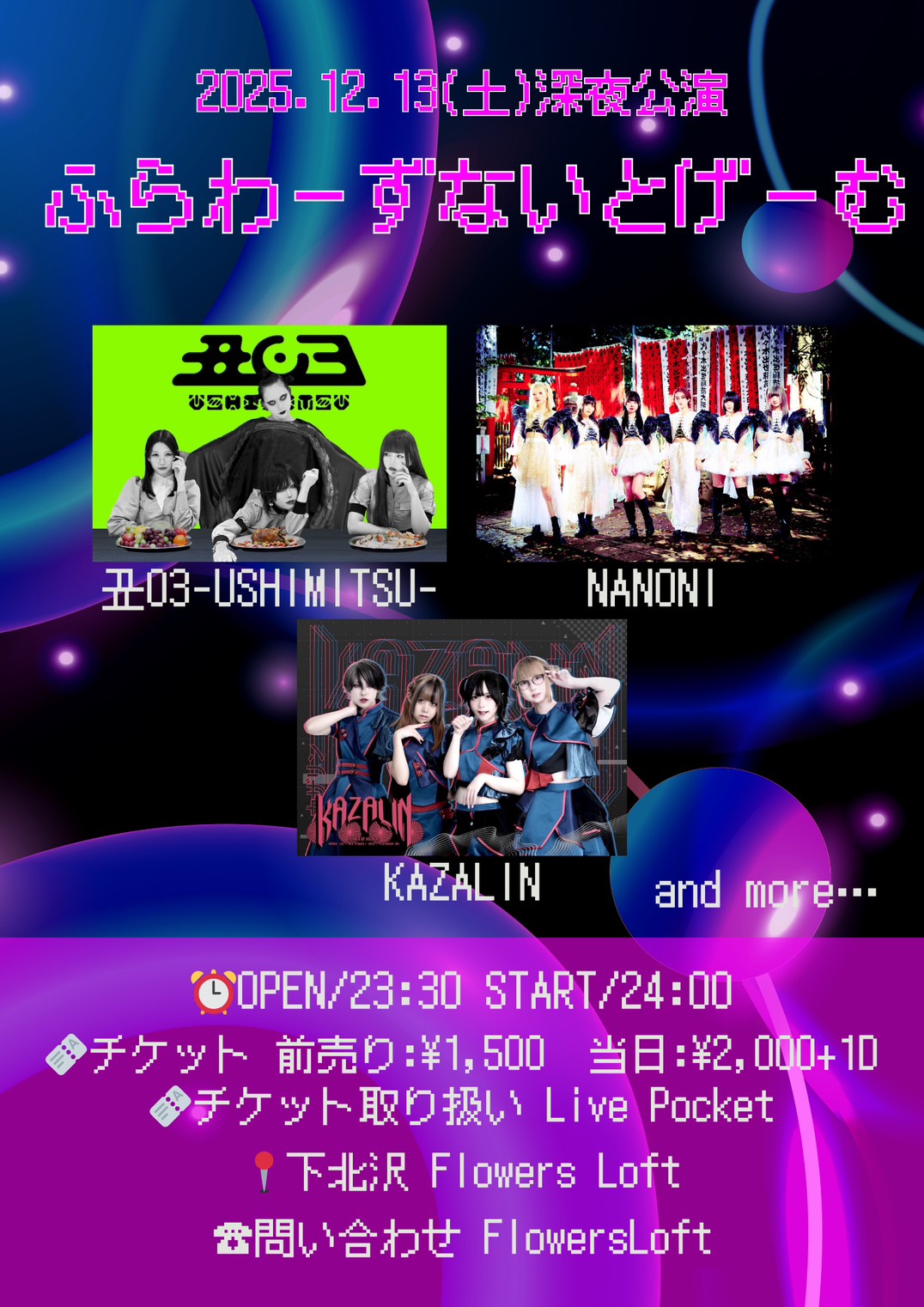 SCHEDULE 2025 12 13 Saturday MIDNIGHT EVENT 『ふらわーずないとげーむ』 OPEN 23:30 - START 24:00 Tweet NANONI KAZALIN 丑03-USHIMITSU- and more… TICKETADV ¥1,500 / DOOR ¥2,000(+1D) ※深夜公演の為18歳未満の入場はお断りさせて頂きます。 【TICKET】 LivePocket #NANONI#KAZALIN#丑03-USHIMITSU- Share