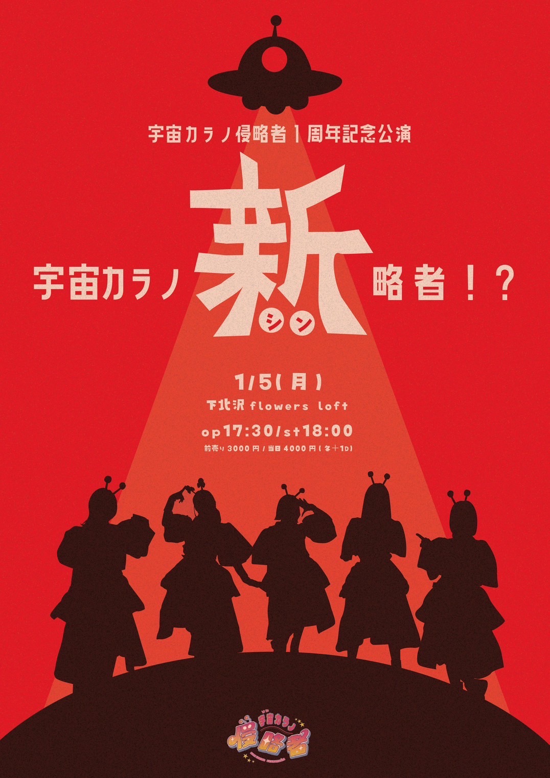 SCHEDULE 2026 01 05 Monday 『宇宙カラノ侵略者1周年記念公演 〜宇宙カラノ“新”略者!?〜』 OPEN 17:30 - START 18:00 Tweet 宇宙カラノ侵略者 TICKET料金: 前売り3000円/当日4000円(各+1D) https://ticketdive.com/event/0105_Shinryakusya Share