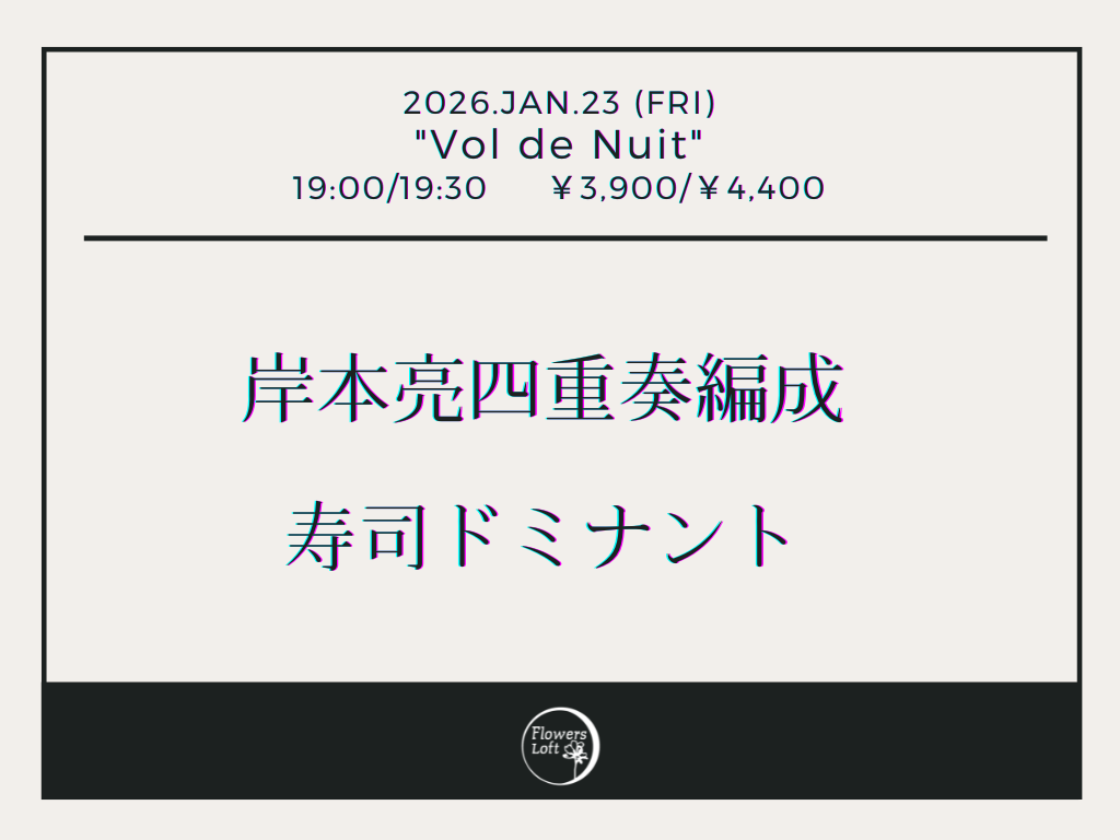 SCHEDULE 2026 01 23 Friday Flowers Loft presents Vol de Nuit OPEN 19:00 - START 19:30 Tweet 出演: 岸本亮四重奏編成 寿司ドミナント TICKETADV ¥3,900 DOOR ¥4,400 (1D別) チケット: 以下にてチケット予約受付(整理番号順 優先入場) Share チケット予約