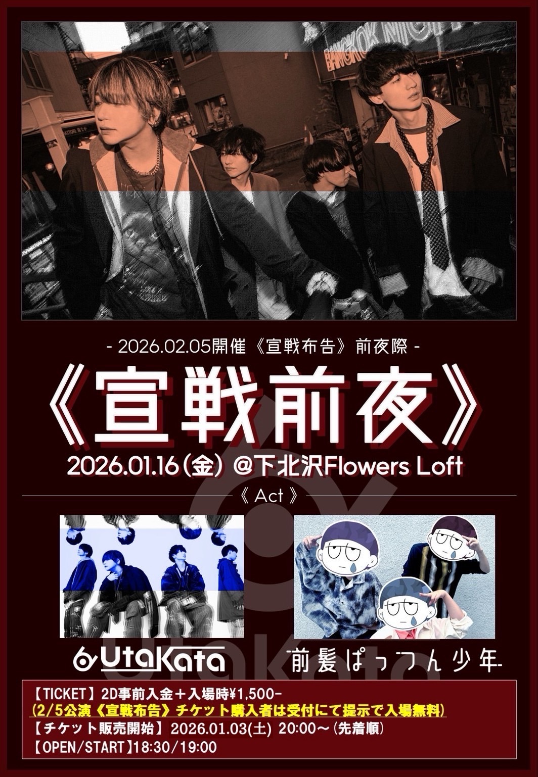 SCHEDULE 2026 01 16 Friday 宣戦前夜 OPEN 18:30 - START 19:00 Tweet UtaKata 前髪ぱっつん少年 TICKETADV ¥0 / DOOR ¥1,500 or 2/5のチケット提示で¥0(+2D¥1,200) ※前売り購入時事前別途2ドリンク代¥1,200お支払いを頂きます。 前売り券購入済みのお客様は当日ドリンクチケットをお渡しいたします。 【TICKET】 LivePocket(〜2026/1/15 23:59) #UtaKata#前髪ぱっつん少年 Share