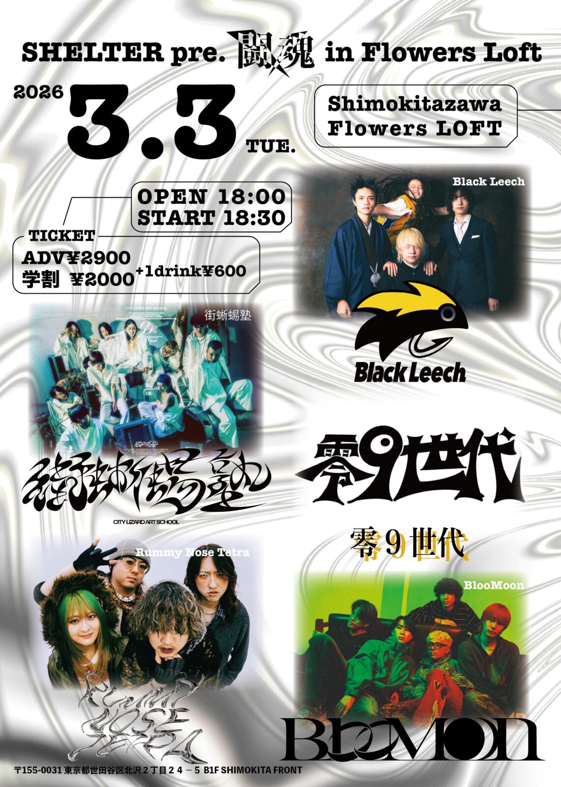 SCHEDULE 2026 03 03 Tuesday Shimokitazawa SHELTER pre. 闘魂 in Flowers Loft OPEN 18:00 - START 18:30 Tweet Black Leech 街蜥蜴塾 BlooMoon 零9世代 Rummy Nose Tetra TICKETADV ¥2,900 / DOOR ¥3,400 / 学割 ¥2,000(+1D¥600) 【TICKET】 Flowers LOFT HP予約 各出演者予約 #Black Leech#街蜥蜴塾#BlooMoon#零9世代#Rummy Nose Tetra Share チケット予約