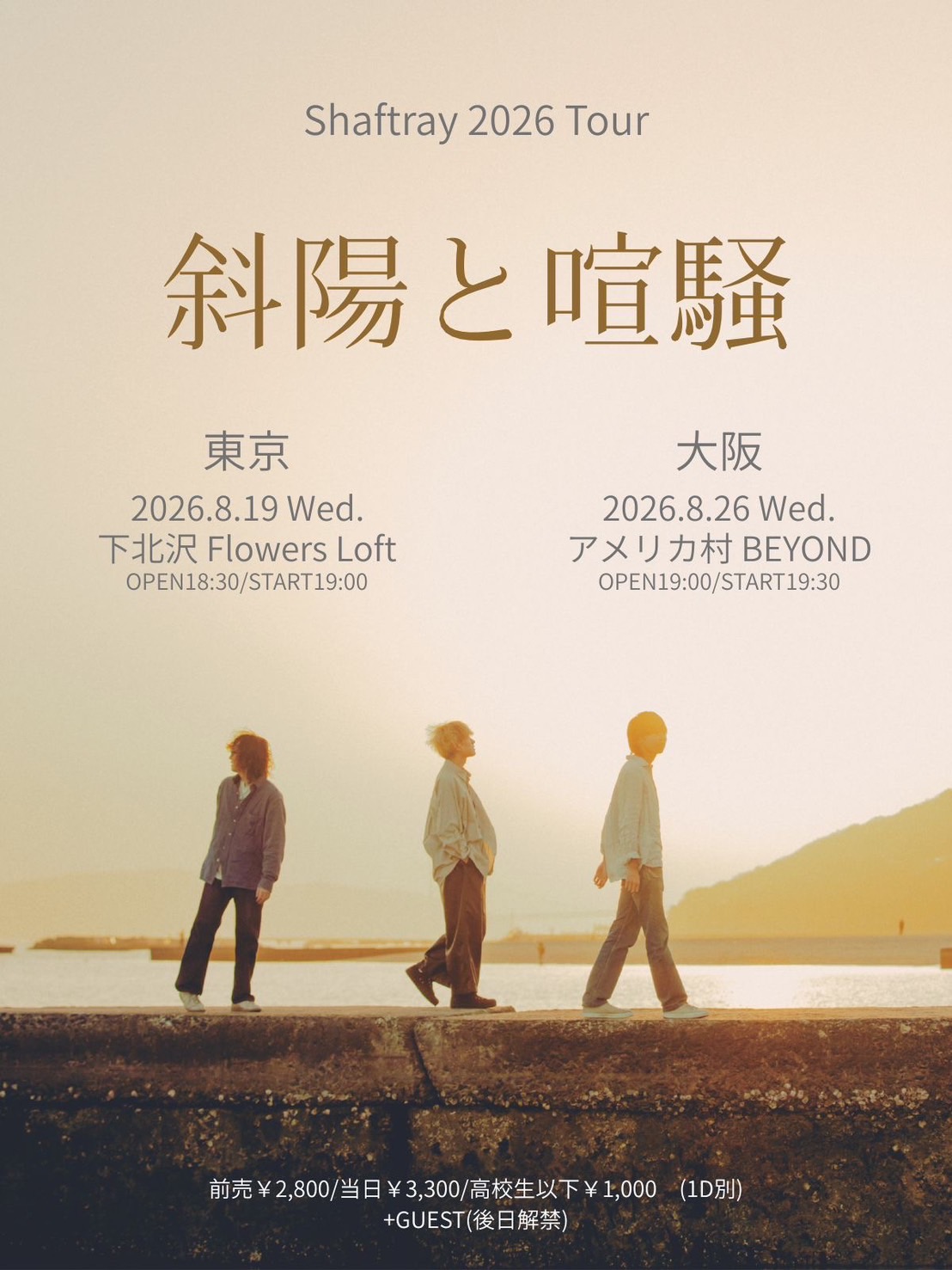 SCHEDULE 2026 08 19 Wednesday Shaftray 2026 Tour 「斜陽と喧騒」 OPEN 18:30 - START 19:00 Tweet Shaftray +GUEST(後日解禁) TICKETADV¥2,800 / DOOR¥3,300 / STU¥1,000 (+1Drink) ※手売りまたはイープラスにて販売 (入場順:手売り→イープラス) ※学割は入場時に学生証提示 Share