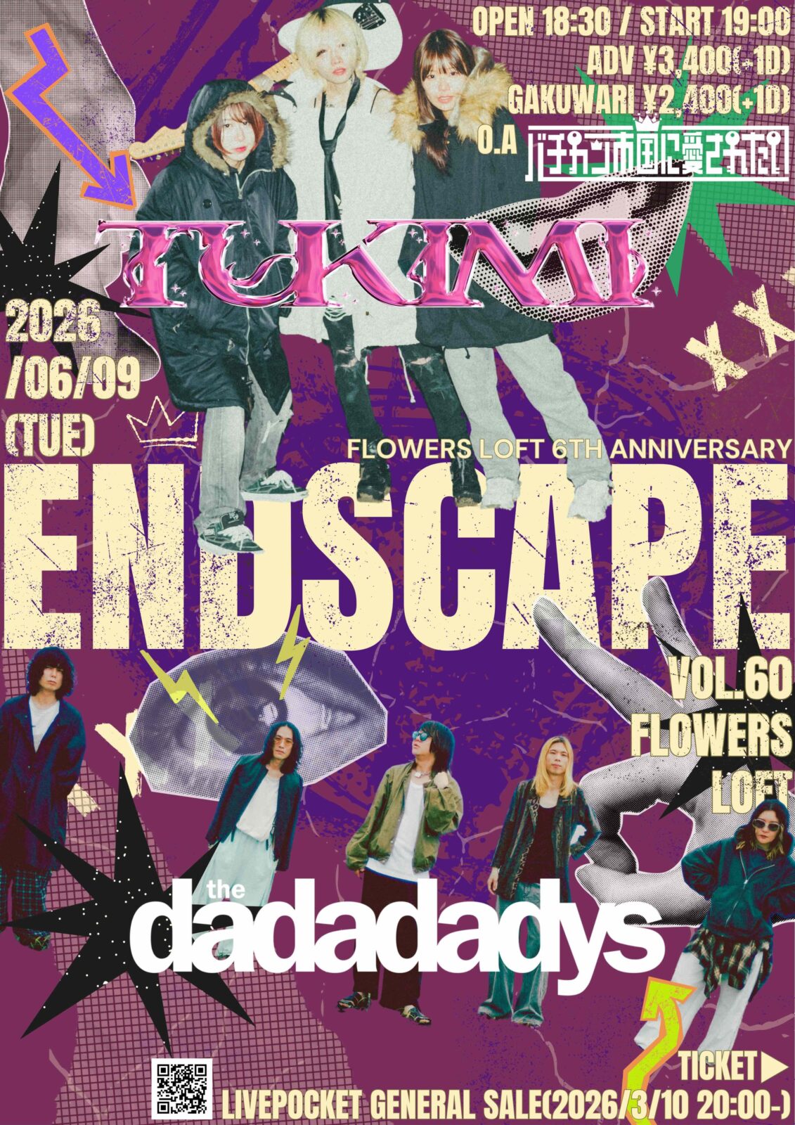 SCHEDULE 2026 06 09 Tuesday Flowers LOFT 6th Anniversary 『ENDSCAPE vol.60』 OPEN 18:30 - START 19:00 Tweet the dadadadys つきみ バチカン市国に愛されたい(O.A) TICKETADV ¥3,400 / DOOR ¥3,900 / 学割 ¥2,400(+1D) 【TICKET】 LivePocket(2026/3/10 20:00〜) #the dadadadys#つきみ#バチカン市国に愛されたい Share
