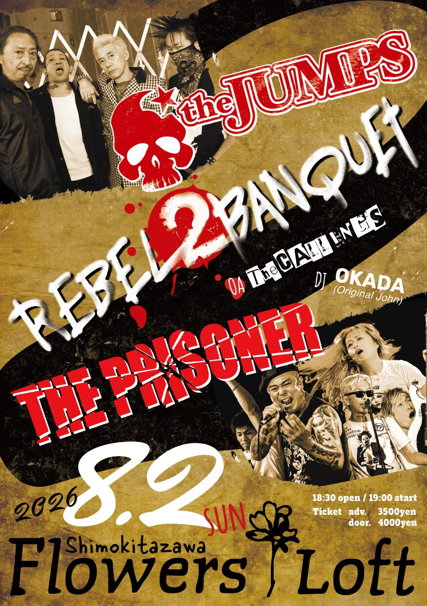 SCHEDULE 2026 08 02 Sunday REBEL 2 BANQUET OPEN 18:30 - START 19:00 Tweet the JUMPS THE PRISONER OA The CALLINGS DJ OKADA(Original John) TICKETCharge ¥3500 / ¥4000 (1D別) 3/21(土)12:00〜 e+にてチケット発売開始 ■購入ページURL https://eplus.jp/sf/detail/4503210001-P0030001 Share