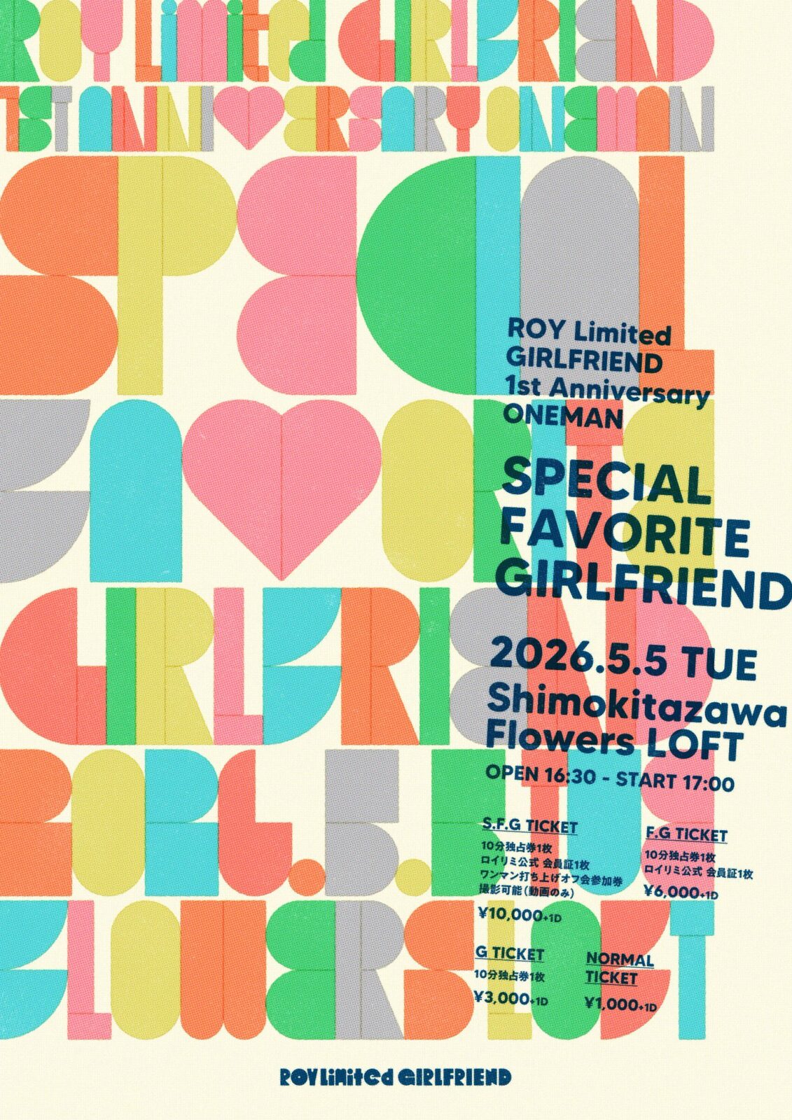 SCHEDULE 2026 05 05 Tuesday ROY Limited GIRLFRIEND 1周年ワンマン 『SPECIAL FAVORITE GIRLFRIEND』 OPEN 16:30 - START 17:00 Tweet ROY Limited GIRLFRIEND TICKET①S.F.Gチケット 10分独占券 1枚 ロイリミ公式 会員証1枚 ワンマン打ち上げオフ会参加券 撮影可能(動画のみ) 10000円+1D ②F.Gチケット 10分独占券 1枚 ロイリミ公式 会員証1枚 6000円+1D ③Gチケット 10分独占券 1枚 3000円+1D ④NORMAL チケット 1000円+1D 入場順 ①▶︎②▶︎③▶︎④ Share